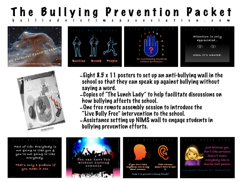 Many schools don’t have enough funding or staff to deal with all the issues that they face. Bullying is an issue that can affect individual students as well as the school environment. Schools may need assistance dealing with bully incidents. The Bullied Victims Association can be a third party resource to help schools deal more effectively with bully incidents. The BVA can work with each school’s budget to help create a better learning and social environment. The general public can help by donating to the BVA so “Bullying Prevention Packets” can be sent out to schools across the country for free.